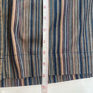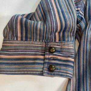 In good preowned condition! Beautiful vertical striped button down top by Dress Barn. Stripes are tan, blue, pink, and white. Love the three large bronze decorative buttons at the top and then the hidden buttons below.