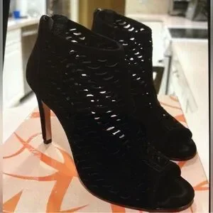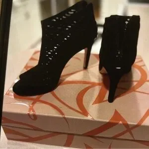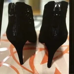 Stylish black ankle booties with cutout design. Peep-toe style for a modern look. Perfect for any occasion.