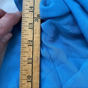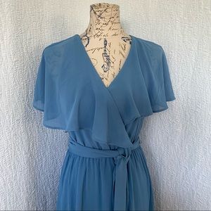 Show Me Your MUMU cape like ruffle wrap bodice with tie belt and gathered skirt. Stock pics are a lighter blue dress. Features flutter sleeves, surplus neck, tie belt, partially lined, and 100% polyester. Made USA . length about 60 inches