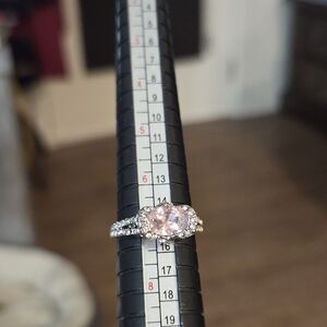 Elegant ring with a pink gemstone and silver accents. Perfect for adding a touch of glamour.