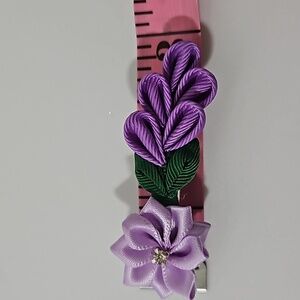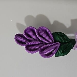 The flower hair clips are made of grosgrain ribbon, attached with a barrette clip, 2.5" metallic silver color Each flower clip is carefully handmade and wear-resistant to ensure they are durable and shaped Dark green on leaves and stem. 2-tones of purple on the flowers, embellished with a silk 1" Flower lavander purple with rhinestone in the center. Diameter 3" x 1"