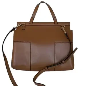 Leather Satchel with gold tone logo letters, top handle and detachable shoulder strap, flap and magnetic closure. Unlined with two open compartments divided by a zippered one