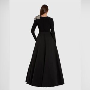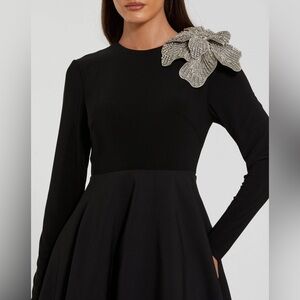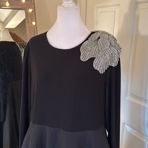 Elegant black maxi dress. Features a striking silver embellishment on the shoulder. Long sleeves and flowing skirt.