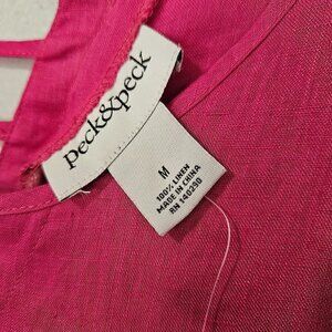 Peck & Peck 100% women's linen casual pullover top; Size M. This hot pink top will add a splash of color to your wardrobe when topped over most any skirt or pants. features Interesting lattice front and back opening detail, Tab loops on 3/4 length sleeves adds flair, Bottom slits on each side make it easier to pull on. New with Tag.
