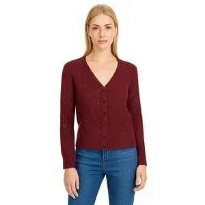 workwear, office, business casual, career, meeting outfit, executive style, classic, timeless, elegant, chic, sophisticated, modern, minimalist, polished, refined, classy, feminine, versatile, stylish, high-quality, upscale, sleek, elevated, professional, evening, dressy, cardigan sweater, button-front knit top, deep burgundy wine red maroon, subtle shimmer speckled sparkle, soft cozy knit fabric, fitted classic silhouette, casual everyday layering, fall winter wardrobe, versatile chic refined timeless, elegant polished feminine, office wear smart casual, cool weather essential
