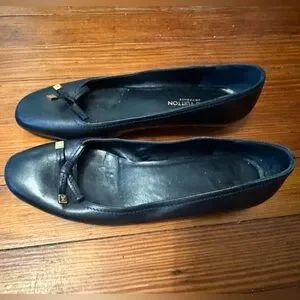 Chic black leather flats with elegant gold accents. Perfect for versatile styling.