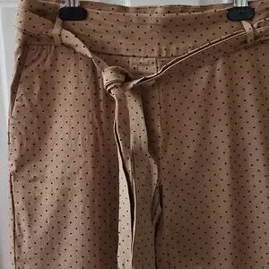 Tan pull on pants with black polka dot print. Removeable tie waist belt.