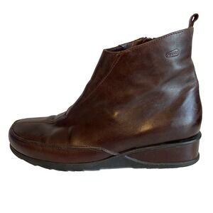 * Made of leather with a low wedge heel, these boots feature a round toe, zip closure, and a solid brown color.