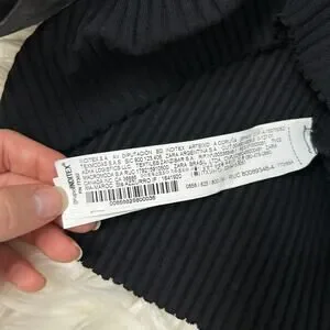 Black long sleeved one-shoulder cropped top with ribbed knit fabric and asymmetrical glamorous organza detail. Perfect for Holiday parties and New Years Eve! Would look amazing with a long full skirt.