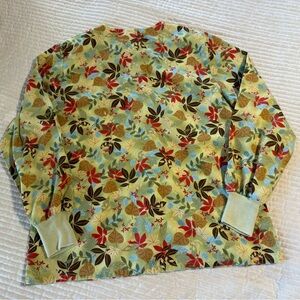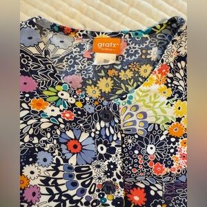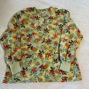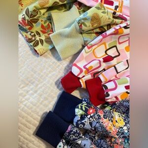 3 size medium lab coats. Button or snap close. Lower front pockets. Blue floral has tie in the back. Care tag on blue one has worn and is unreadable. Some wear to the cuffs of the sleeves.
