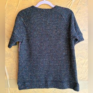 Back, sleeves and trim are knit in a black yarn speckled with multi-colors.