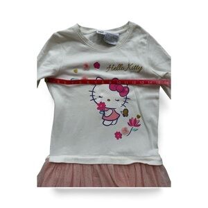 Adorable Hello Kitty dress featuring a white top with a pink tulle skirt. Perfect for fans of the iconic character.