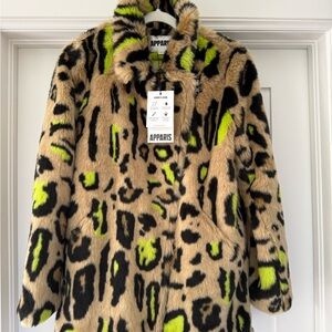Bold teddy jacket with neon green and black patterns. Soft faux fur for warmth and style. Perfect for a standout look.