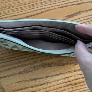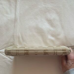Chic Coach wristlet with signature pattern. Beige tones for versatile style. Ideal for essentials on the go. Excellent condition