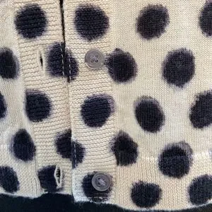 Chic and stylish polka dot cardigan sweater in black and cream. Perfect for adding a playful touch to your wardrobe.