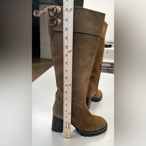 Elegant brown heeled boots. Suede finish. Knee-high design. Perfect for stylish outings.