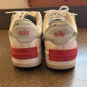 Nike Air Force 1 White leather with mint swoosh and pink details. Excellent used condition. Size 12 women.