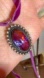 Stunning dragoons breath glass that seems to change colors from royal purple to burnt orange to magenta on a lovely pendent. Victorian pendent with a larger cabochon glass stone set in a sterling silver frame with tiny balls that look like scallops around it. Double bail that can accommodate a chain but has a matching magenta velvet ribbon. Feminine ribbons ties around your neck in true Victorian fashion. Heavy antique piece is dramatic and magical looking.