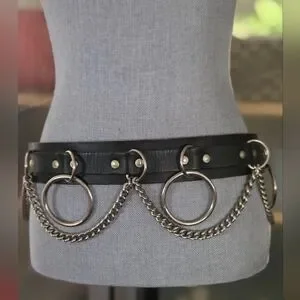 Y2K Draping Chain Halter O-Ring Black Leather Belt Silver-Tone Gothic Punk Rock