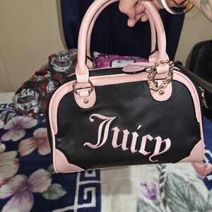 Elegant Juicy Couture satchel with bold black and pink design. Features stylish handles and gold accents.