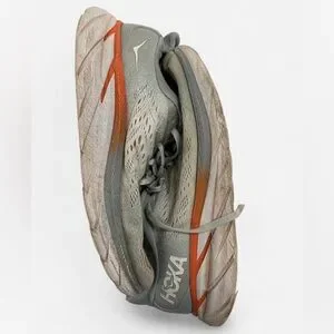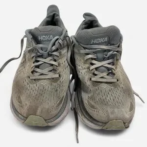 Hoka One One Clifton 8 running shoes in a light gray with orange accents. Size women’s 9. These have definitely logged some miles—scuffs, tread wear, and insole wear (see all pics). Still comfy and breathable with plenty of life left for walking, work, or backup kicks. Great deal if you love Hokas and don’t mind some wear.