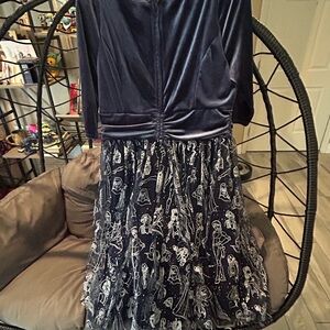Stunning navy dress with a velvet top and tulle skirt. Features a beautiful pattern of female Star Wars icons on the skirt.