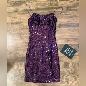 Dazzle your Valentine in this stunning Purple Sequin Bodycon Mini Dress! Shimmering sequins adorn the stretch knit fabric, cascading from rounded spaghetti straps into a princess-seamed bodice with a scoop neckline. The figure-flattering bodycon silhouette accentuates your curves, making it perfect for a special occasion. NWT, size XXS.