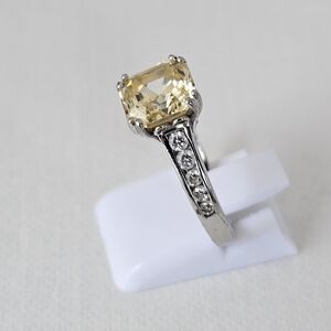 Gorgeous sparkling yellow asscher cut diamond simulant with white diamond accents. The band is crafted of sterling silver with platinum overlay. Size 6.