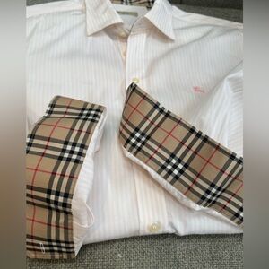 Stylish Burberry shirt with subtle stripes. Features iconic check pattern on cuffs.