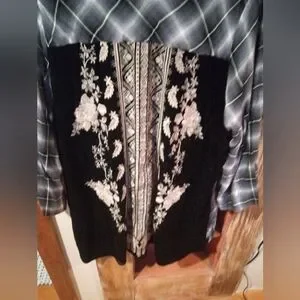 Stylish black plaid front with intricate gray floral embroidery on crushed black velvet.Features a plaid pattern on the shoulders.A beautiful top...wore I think 3 time's... Great liké new construction.non smoking home and pet free home