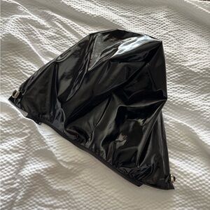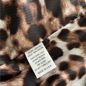 ▫️New York Based Mycra PAC black patent raincoat jacket featuring leopard lining, 2 side pockets, notch collar and detachable hood.