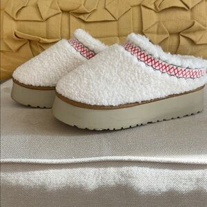 Warm fleece slippers white with red accents. Perfect for comfort and style.