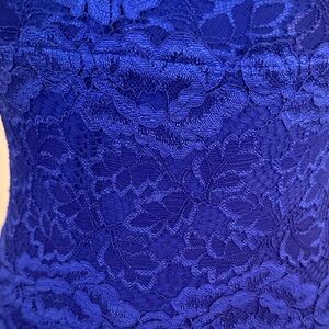This elegant royal blue lace sleeveless top is perfect for any occasion. Its intricate lace design adds a touch of sophistication to your wardrobe. This top is very form fitting. It is 82% nylon and 8% spandex.