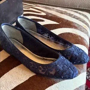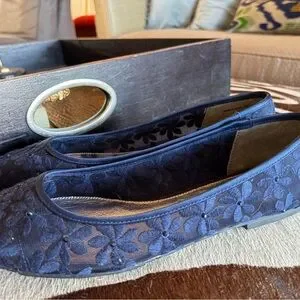 Chic dark blue flats with floral design. Ideal for everyday elegance.