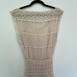 Elegant cream maxi dress with fringe details. Sleeveless and stylish. Perfect for any occasion.