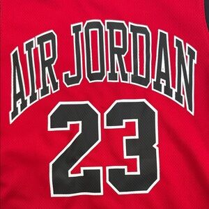 Bold red Jordan jersey with black trim. Features iconic Air Jordan and number 23 design. Perfect for young sports fans. Brand new with tags