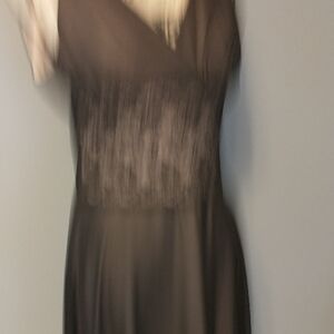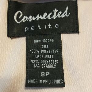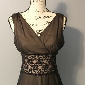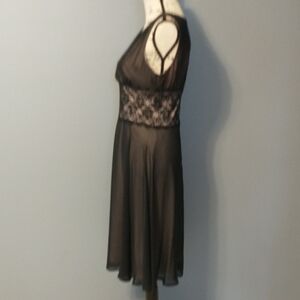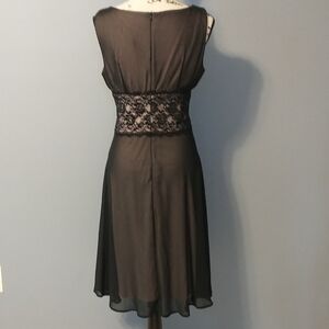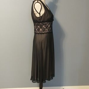 Elegant black midi dress with lace bodice. Sheer black fabric overlay on pale pink fabric. Perfect for evening wear. 39 inches long. 17-1/2 inches armpit to armpit. Back zipper. Never worn.