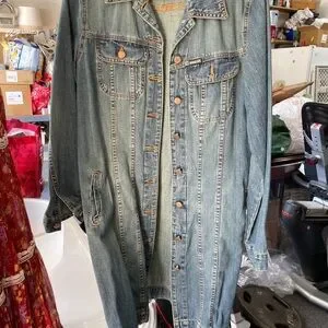 late 90’s long jean jacket. So cool! Features a classic button-up design with multiple pockets for convenience. Size is Large, but fits more like a medium! Tailored fit.