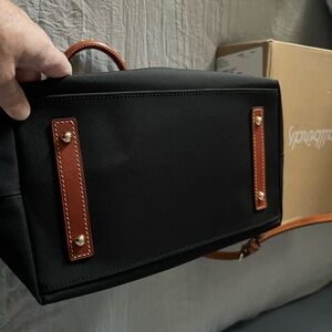 Chic black satchel with brown accents. Features sturdy handles and detachable strap. Ideal for versatile styling. Nylon/canvas