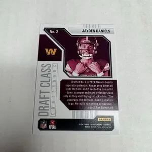 The 2024 Panini Contenders Jayden Daniels Draft Class Rookie Card is a standard-sized sports trading card featuring the player from the Washington Commanders in the National Football League (NFL). This original card is made of card stock and is part of the Draft Class insert set for the 2024 season. With the player's name, card number, and team printed in English, this collectible item is a must-have for fans and collectors of football trading cards.