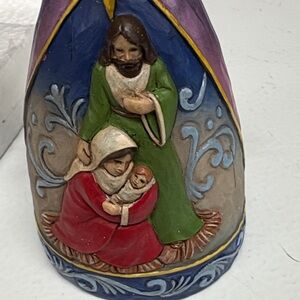 Beautifully crafted angel ornament by Jim Shore. Features intricate nativity scene. Rich brown and cream tones.