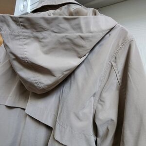 Stylish beige trench coat with a classic design. Features a belted waist and button details. like new