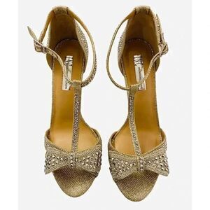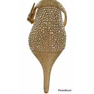 Like new Gorgeous formal crystal detailed open toe sandals. Has a t-strap and goes around the ankle. Front is crystal bow. A gold champagne color covered with silver crystals. Behind crystals is a textured champagne background. Only wore in house.