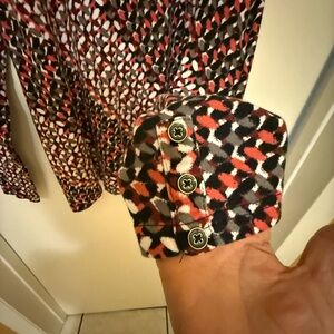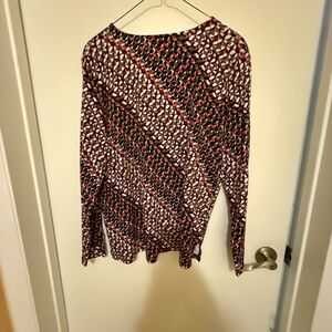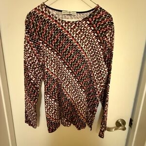 Chic long sleeve top with a striking geometric pattern. Features a blend of red and black hues. Perfect for adding flair to any outfit.