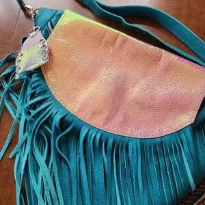 "Drop Thread Gorgeous" crossbody bag with iridescent flap and turquoise fringe. There is a small flaw that is only visible from certain angles. I've marked it with an arrow in the last picture and priced the bag accordingly.