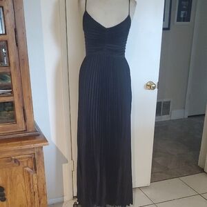 Sophisticated black maxi dress with pleated design. Features spaghetti straps and a flattering fit. Perfect for formal occasions.