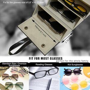 Features: Innovative foldable design with 5 slots to store multiple pairs of sunglasses and glasses without taking up extra space. When rolled up, it forms 5 airtight compartments, ensuring maximum protection and organization. Comes with a handy strap to hang anywhere — perfect for on-the-go or at home. Its spacious yet compact size (expanded: 18.5"x6.5", rolled: 6.5"x4.7"x3.1") fits most glasses styles, including oversized and kids’ glasses. Sturdy PU leather exterior with flocked interior protects your lenses from scratches and damage. Secure copper snap buckle keeps everything in place.