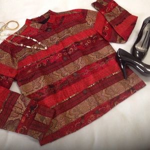 Chicos Jacket Blazer Red & Gold Color Block Mixed Mediums Patchwork Lined Size 1