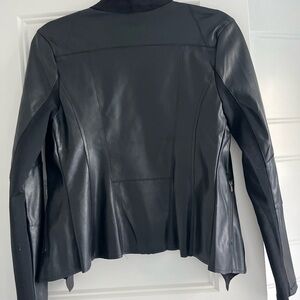 Elevate your style with this Women's Black Light Weight Faux Leather Open Front Jacket. This sleek and versatile piece is perfect for a night out or holiday parties. Worn once, perfect condition.