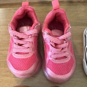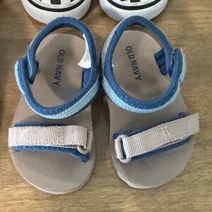Classic Vans slip-ons with a checkered pattern. Easy to wear and stylish for kids. Other shoes include pink Reebok sneakers, old navy sandals, and brown Mary Jane shoes. Sizes 4-5 toddler